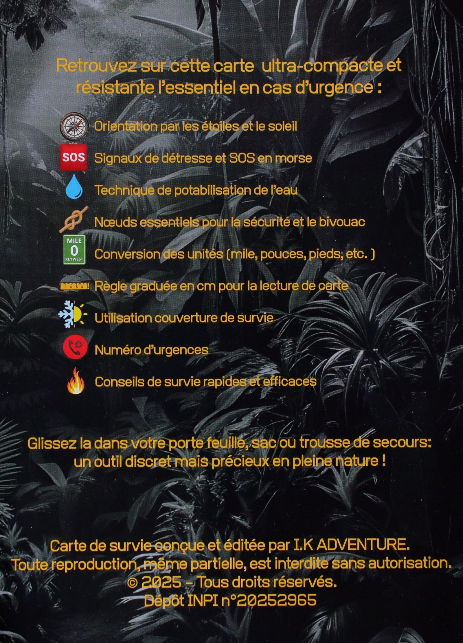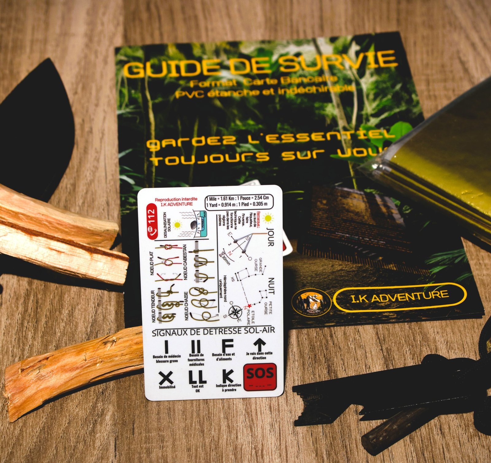 Le Guide de Survie format carte bancaire I.K Adventure est un outil indispensable pour toute personne pratiquant des activités de plein air ou souhaitant disposer d’un support fiable en cas de trou de mémoire.